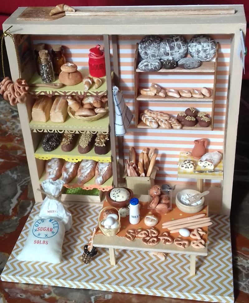 Een bakkerijtje in Bruin Beige tinten. Past goed bij de kleuren van het brood. Gemaakt van hout, papier, polymeerklei, riet en glas. Een grote kast met diverse broden als rustieke, witbroden, granenbroden. Aan de andere kant pains, grove donkere ronde broden, vlechtbroden, zaadbolletjes, stokbroden. Op het kleine tafeltje een stol met een mes erbij en op de grote krentenbollendeeg én gebakken krentenbollen. Net als de krakelingen, die kant en klaar aan de kast hangen. De glazen potjes met zaden kunnen met de lepel eruit geschept worden.