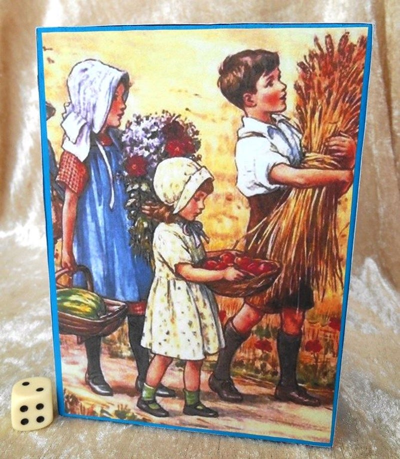 Een bijzonder diorama: open het boekje en vind de schat. Zodra je het boek geopend hebt, zie je een gedetailleerde bakkerij met lekkere broodjes en zo. De voorkant is een afbeelding van kindertjes die de oogst binnenhalen waar al dat lekkers van gemaakt kan worden (Cicely Mary Barker). Gemaakt van een houten doosje met scharnieren, kartonpapier, zijden roosje, afbeelding, aardewerken kruikjes en polymeerklei.
