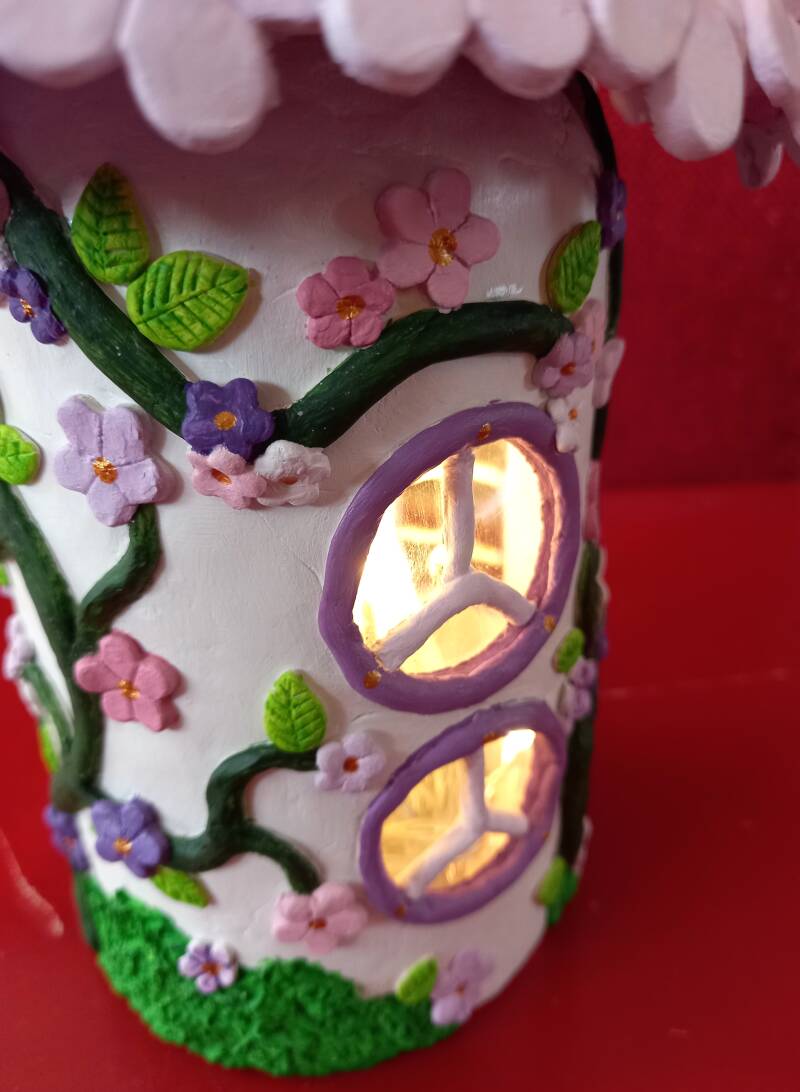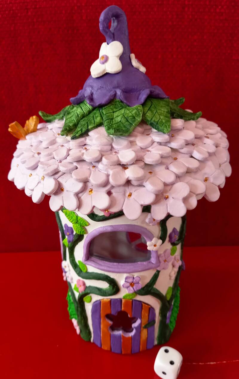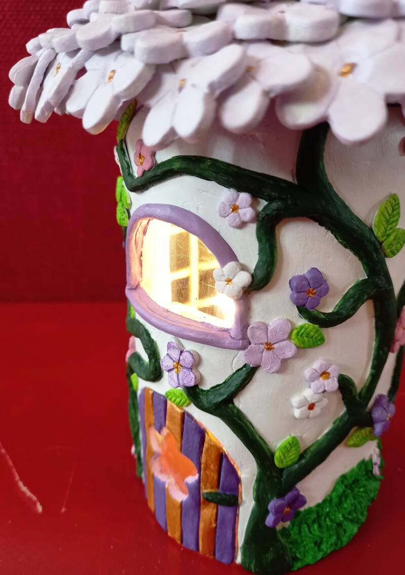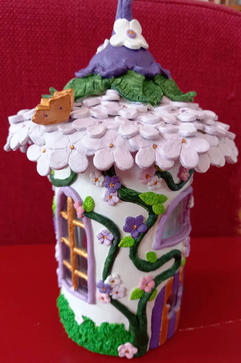 Met zwierende takken waar veel bloempjes aangroeien. De inwoner van dit huisje wilde vooral grote ramen om zoveel mogelijk licht te vangen. Gemaakt van een plastic fles, polymeerklei en acrylverf. Diameter stam 9 x diameter hoed 14 x hoogte 23 centimeter.