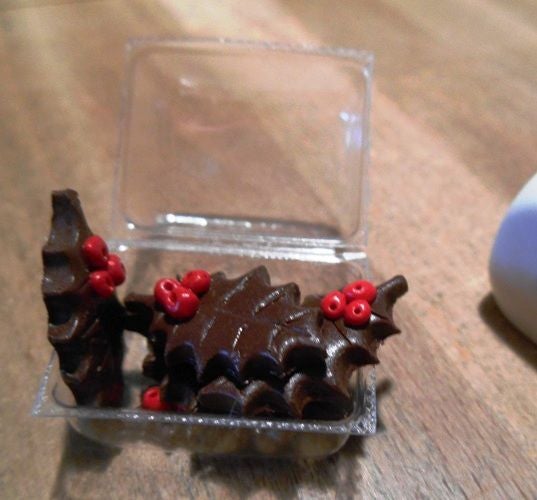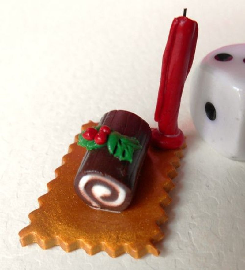 Een yule log met besjes en paddenstoeltjes. Lengte 3,8 x Breedte 2,3 x Hoogte 1,6 cm.