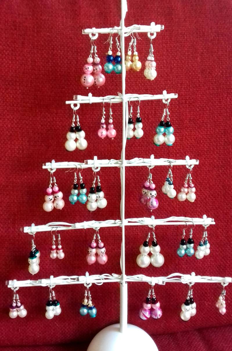 Oorbellen 2021: sneeuwpopjes gemaakt van parelkralen. Nu eens niet gemaakt van kunstklei, maar van parelkralen. Sommige sneeuwpopjes hebben een gezichtje. Verschillende maten in roze, blauw, en wit. De kleinste beginnen bij 1,7 cm, dan telkens een milimeter groter tot 3,5 cm. Zeven paar hebben gezichtjes.