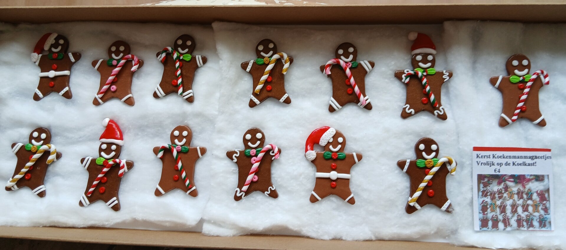 Leuke koekenmannetjes als versiering op de kersttafel en waar je ze maar wilt leggen. Maar deze zijn voorzien van een magneet waardoor je ze op metaal kunt hangen. Superleuk voor op de koelkast. Lengte 5 x Breedte 4 x Dikte 0,2 cm.