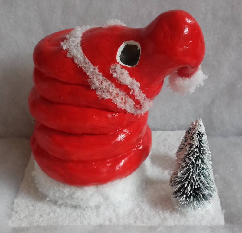 Kabouters wonen in deze paddenstoelen die met kerst versierd worden. Met bosbewoners oefenen ze met het zingen van 'Deck the halls'. Je wordt er blij van! Gemaakt op een houten basis, plastic flessen, aluminiumfolie, polymeerklei, acrylverf, kunstsneeuw. Lengte 29 x Breedte 23 x Hoogte 30 cm. Alleen op verzoek te maken.