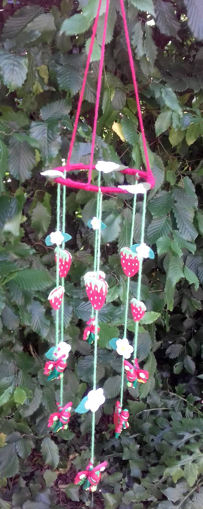 Een vrolijke roodgroene mobile met vlindertjes die leven van aardbeien. Gemaakt van een metalen ring (10,5 cm), wol, vilt en polymeerklei.