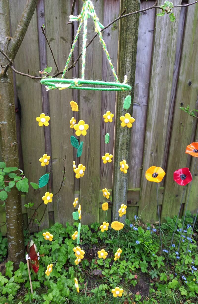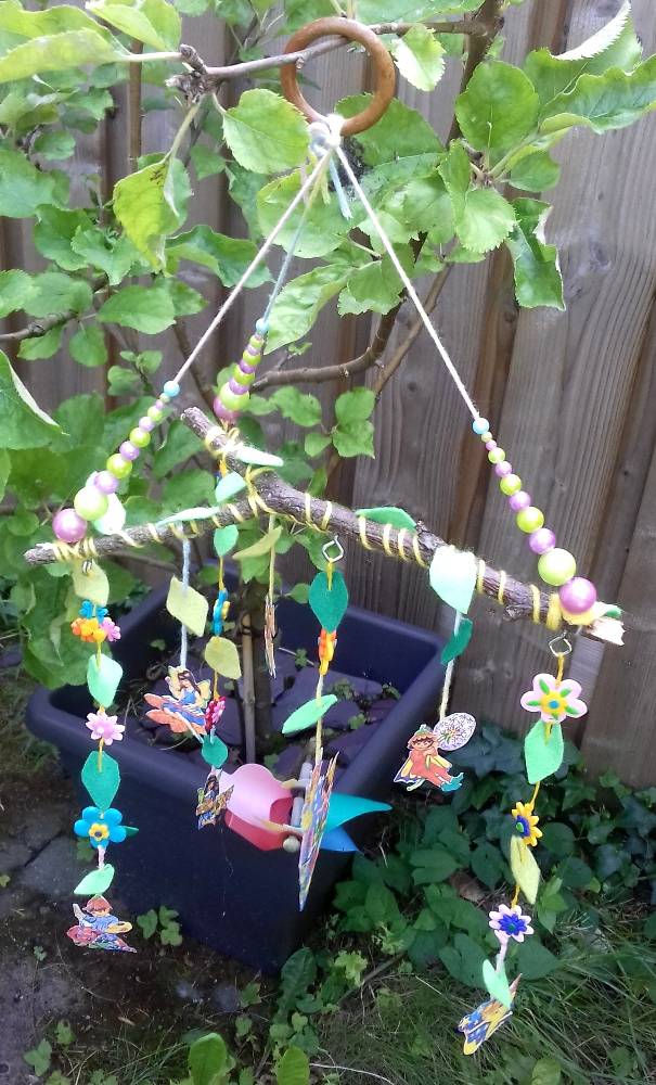 Ook zo gek op elfjes? Dan heb je hier een vrolijke mobile met schattige poesieplaatjes van elfjes. Zes elfjes hangen aan koordjes die weer aan een gevorkte tak om een groter poesieplaatje heen hangen. Gemaakt van wollen draden, vilt, poesieplaatjes, takken, polymeerklei (bloemen), kralen. De mobile hangt aan een kleine houten ring, de tak is ongeveer diameter 24 bij hoogte 47 cm.