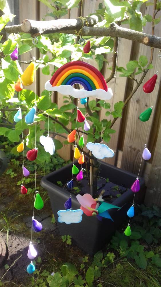 Een heuse regenboog en wolkjes. De regenboogdruppels hangen aan gekruiste takken en in het midden zweven vijf wolkjes voorbij. Gemaakt van takken, polymeerklei, nylondraad. De mobile hangt aan een metalen ring, de takken van deze mobile zijn diameter 16 x 16 x hoogte 40 cm.