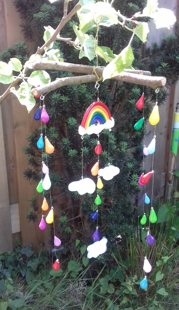 Mobile met regenboog en één wolkje. De regenboogdruppels hangen aan nylondraaden aan een tak uit een geheel bestaat. Vanaf de ring tot de laagste druppel is deze 49 cm lang en de gevorkte tak is ongeveer 22 cm.