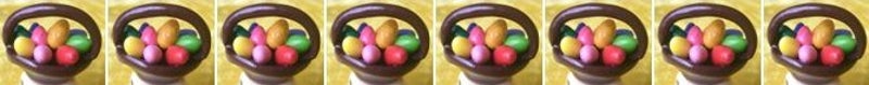 Diverse paasmandjes met kleurige eitjes in diverse mandjes. Diameter variërend tussen 2 en 3 x Hoogte 2,4 en 2,7 cm.