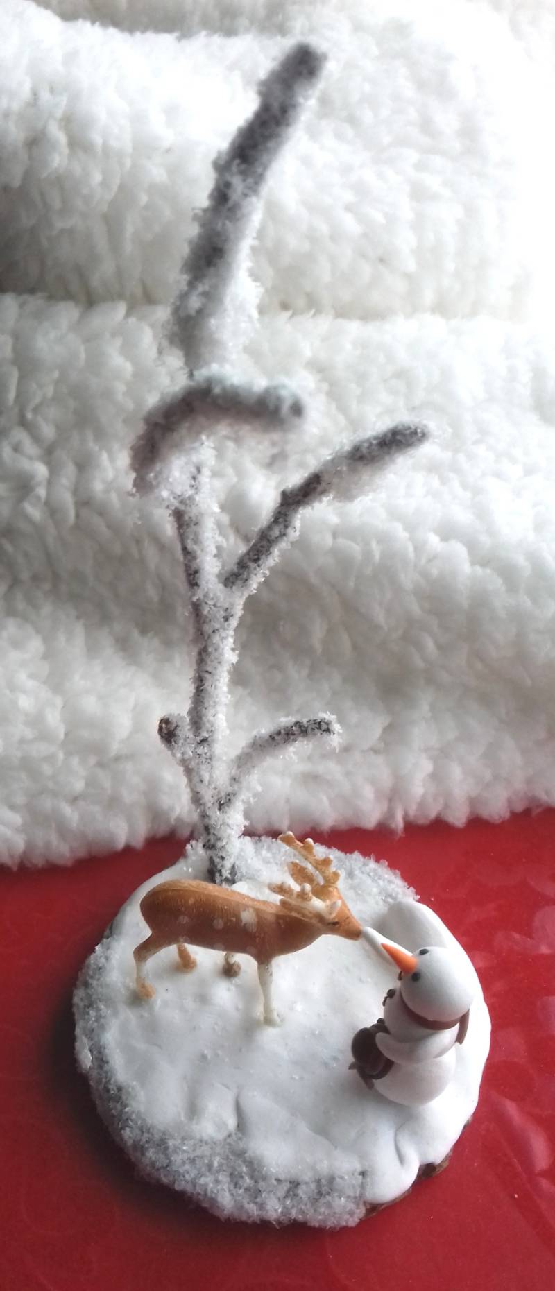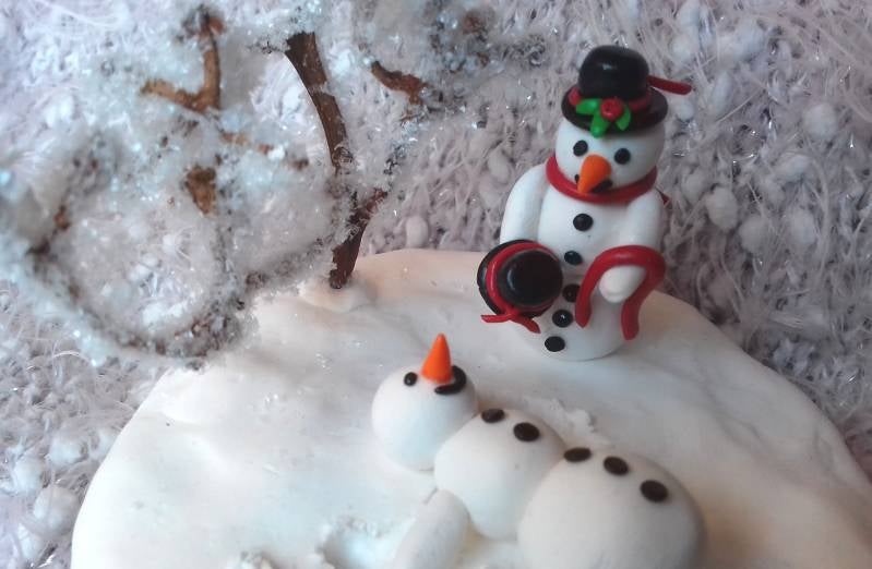 Een sneeuwpop maakt een vriendje... En hij neemt netjes zijn hoed af. Het hertje is van kunststof, de sneeuwpop van polymeerklei.
