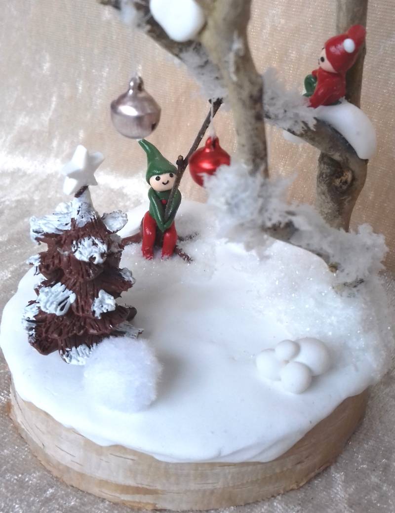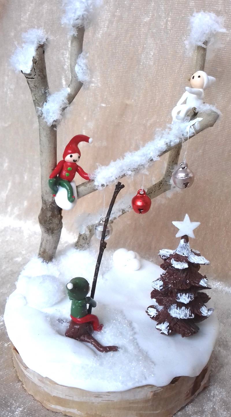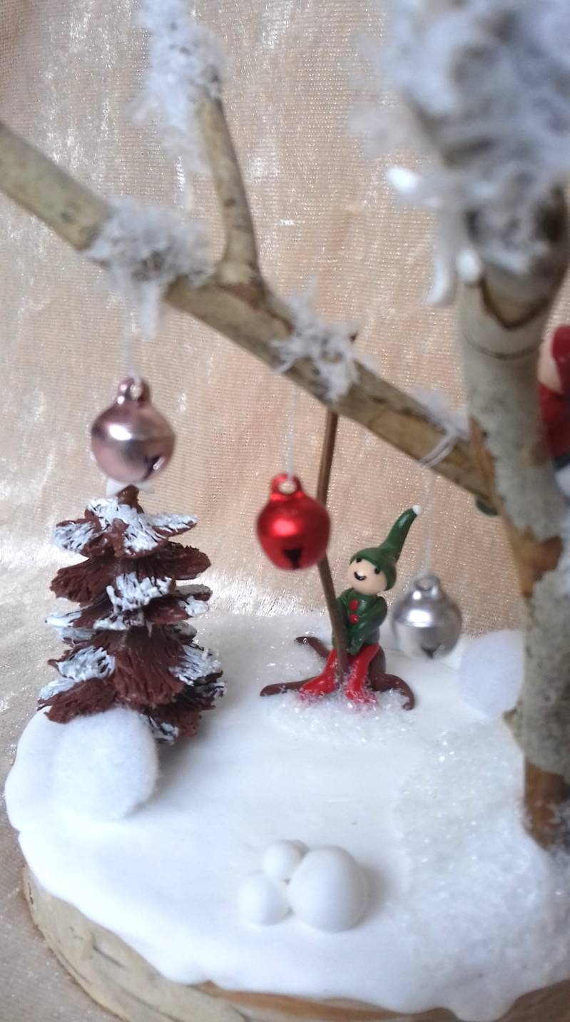 Sneeuwplezier met belletjes! Gemaakt van een houten basis, polymeerklei, takken, fluffy sneeuw en belletjes natuurlijk. De belletjes kunnen echt klingelen :-) Diameter ca.10 cm, hoogte ca. 15 cm.