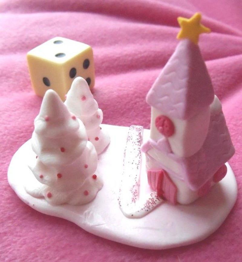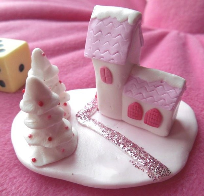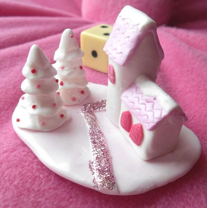 Een klein sneeuwlandschapje met een huisje en twee kerstbomen. Lengte 6 x Breedte 4 x Hoogte 3,5 cm.