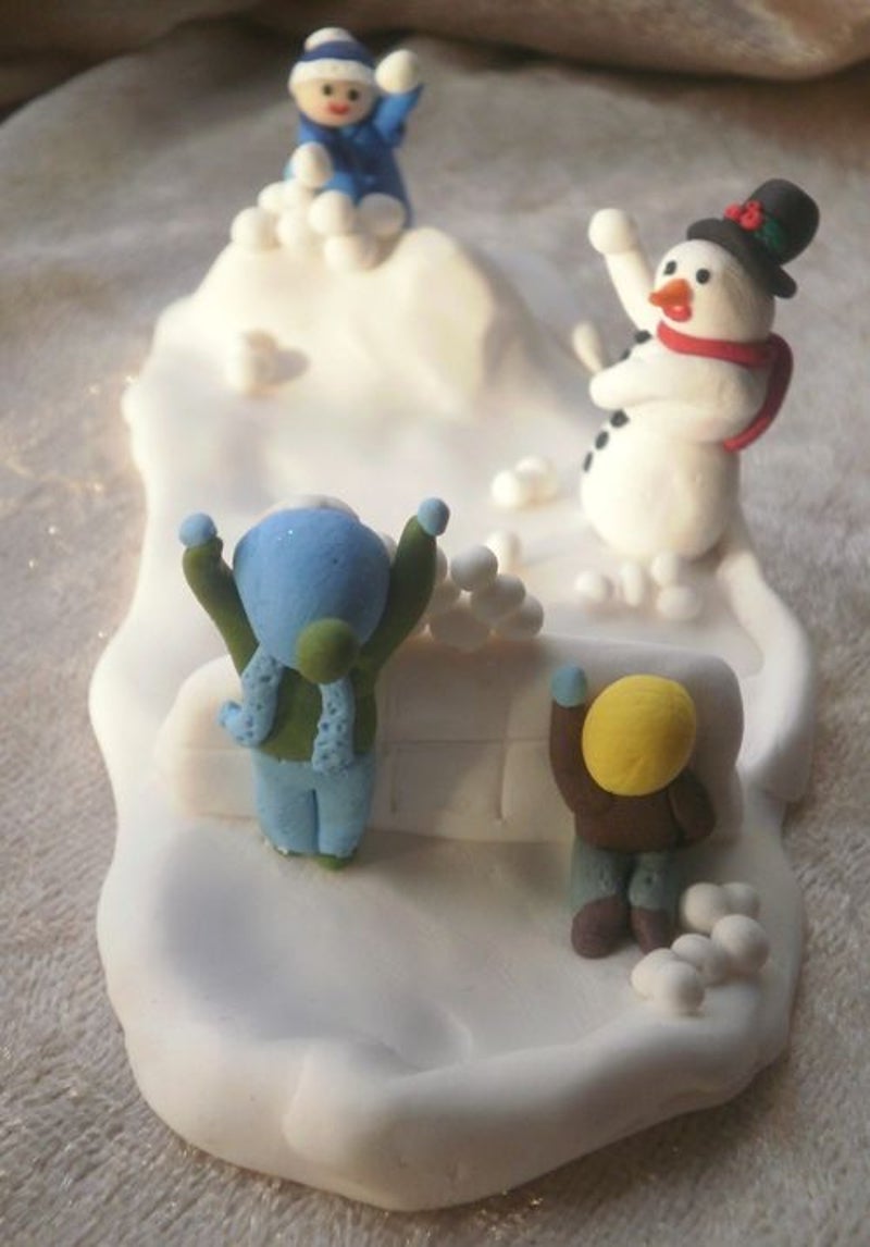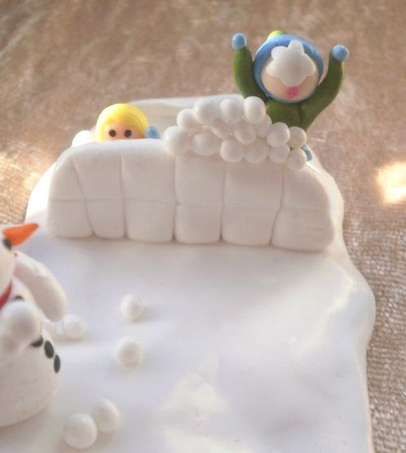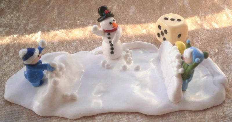 Wie gooit raak? Twee jongetjes gooien er lustig op los terwijl de derde zich verschanst achter de ijsmuur. De sneeuwpop doet stiekem mee. Lengte 11,7 x Breedte 5,1 x Hoogte 3 cm.
