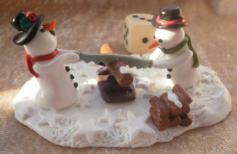 Vijf sneeuwpopmeisjes die kleurige hoedjes dragen bewaken een heerlijke Engelse X-mas pudding. Niemand komt er aan! Of dansen ze alleen maar? Diameter ca. 7,5 x Hoogte 3 cm.