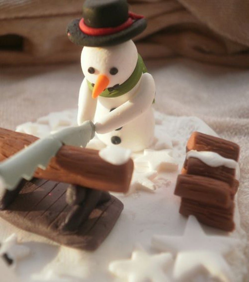 Twee sneeuwpoppen die hout aan het zagen zijn. Ze hebben al een stapeltje af. Met een sneeuwsterrenondergrond. Lengte 8,4 x Breedte 5,6 x Hoogte 3,3 cm.