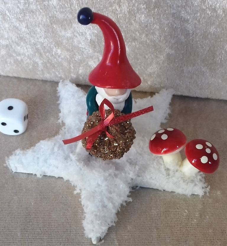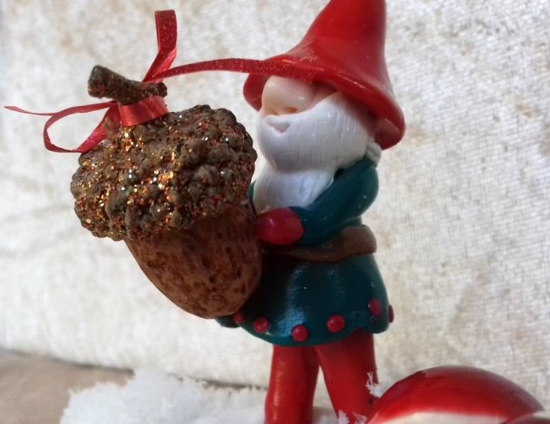 Deze kabouter heeft wel een heel bijzonder cadeau voor zijn vriend de eekhoorn: een supereikel! Gemaakt van hout, kunstsneeuw, kunsteikel, kunstpaddenstoeltjes en polymeerklei. Hoogte 9 x Diameter 9,5 cm.